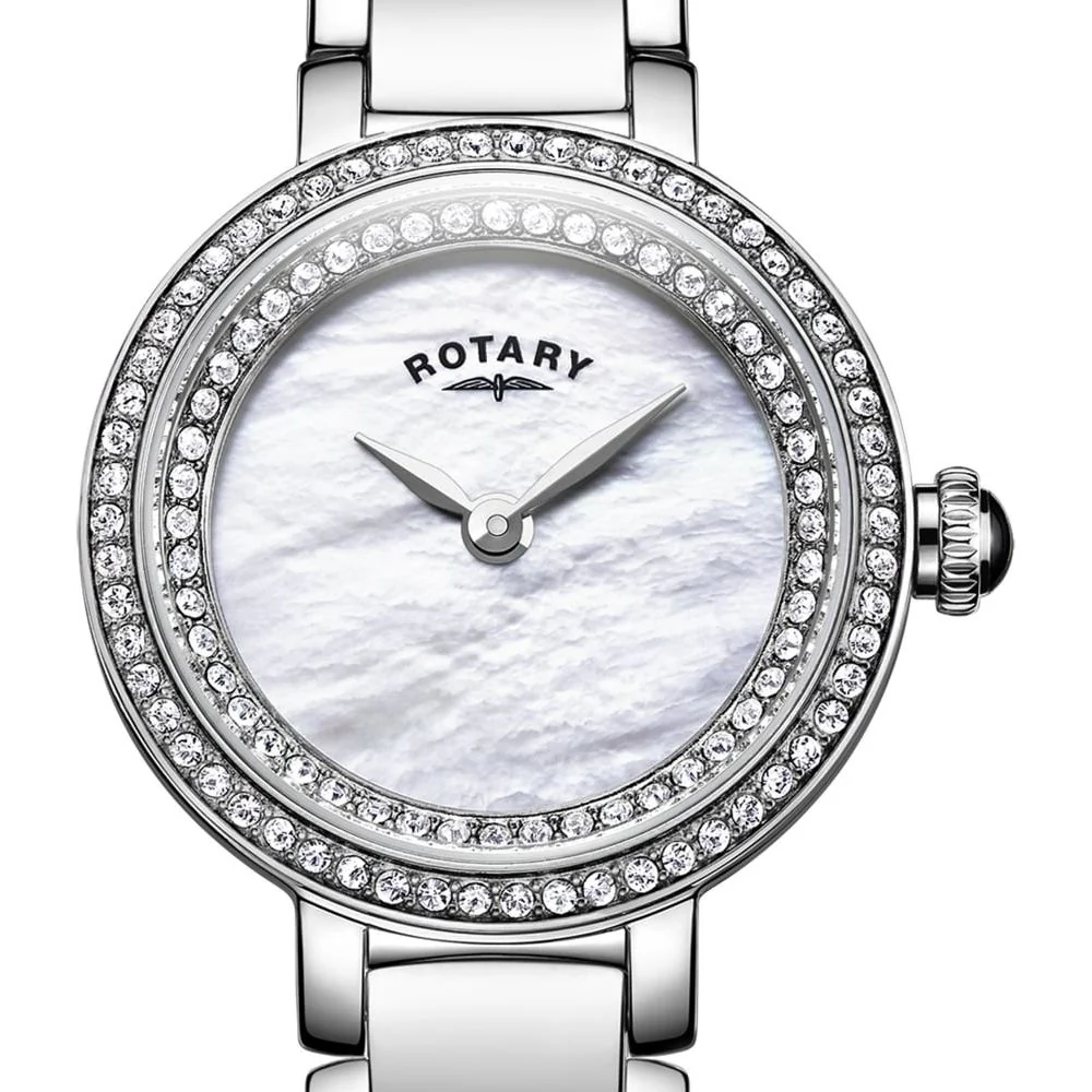 This elegant watch has a chrome plated bracelet strap with a mother of pearl and CZ clasp. The dial has a plain pink mother of pearl face with the Rotary logo. The case has two rows of CZ crystals around the edge. Includes branded packaging and manufacturers guarantee.