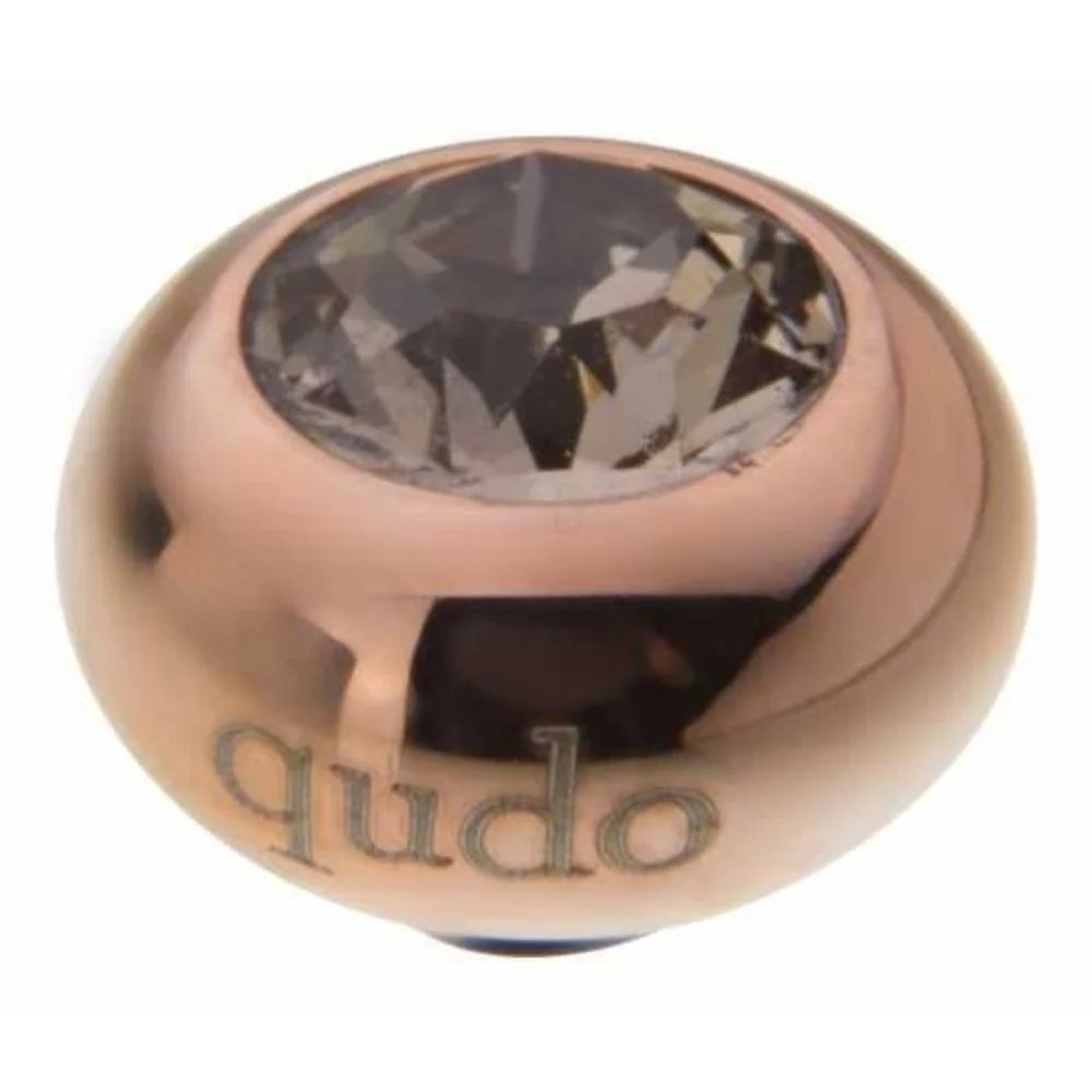 This Qudo Famosa 10mm Tondo Top has a grige Swarovski Gem in a 14ct. Rose Gold Plated Stainless Steel Case. Easily twist on and off the tops to suit any outfit. Hand Made in Germany.