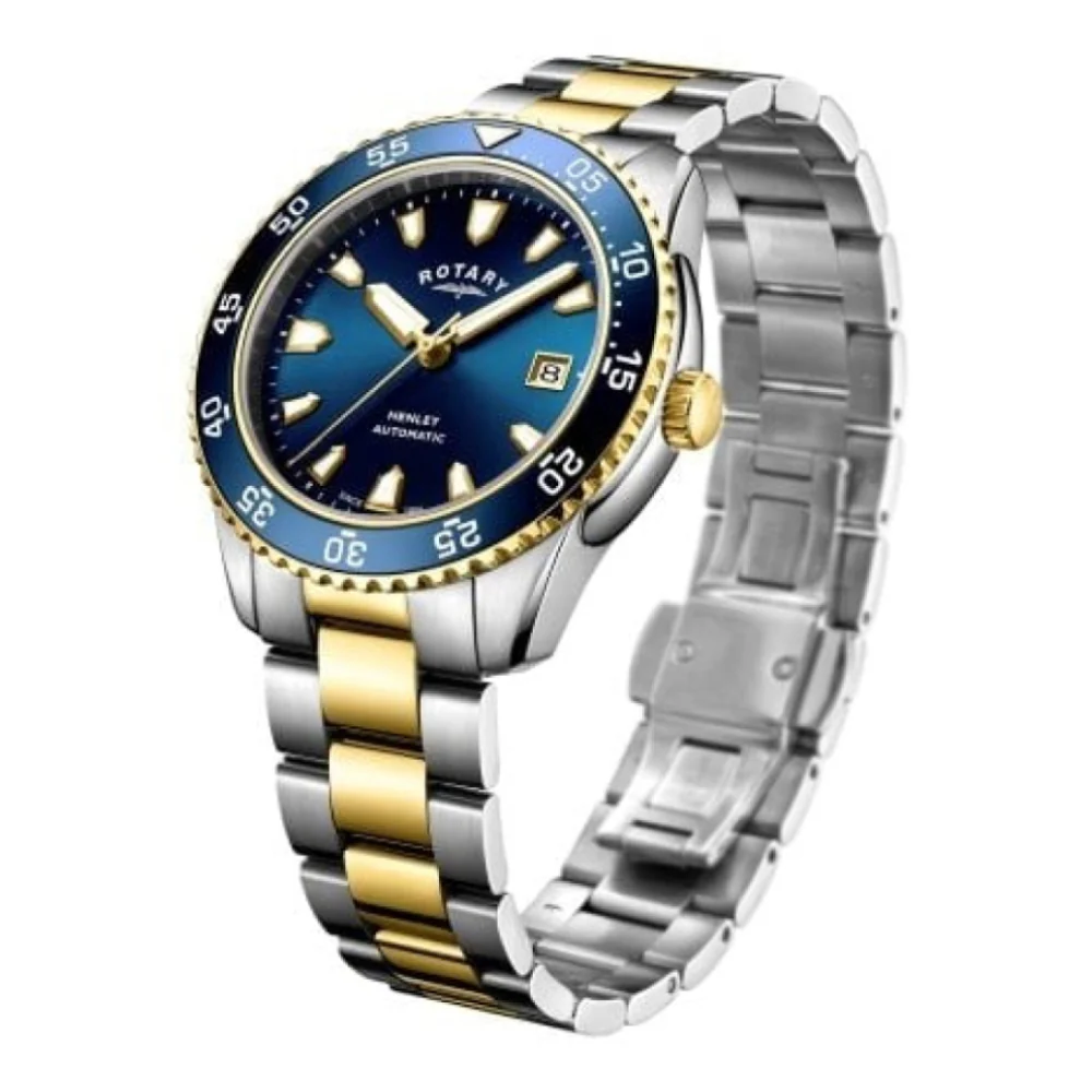 Henley automatic gents watch in stainless steel case with blue dial and two tone bracelet strap from Rotary. This luxurious watch has dark blue tachymeter bezel, date window and stick indexed and 3 hands. This eye catching modern timepiece is perfect for any outfit and can go from the office to after-hours with style. Complete your look with this spectacular watch and makes a standout addition to your collection. This watch will arrive in a branded presentation box and full manufacturer warranty.